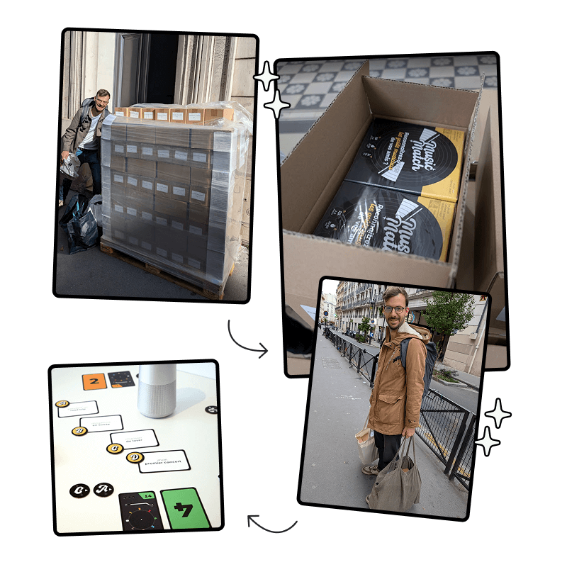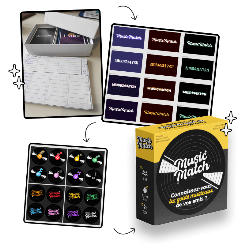 Des dizaines de tentatives, des prototypes à n’en plus finir… On travaille ensemble sur le design et on affine le concept d'un jeu musical dans lequel il faudra deviner les goûts musicaux de ses amis. Et plus de 100 versions des règles réécrites pour arriver à la version de ce jeu musical !